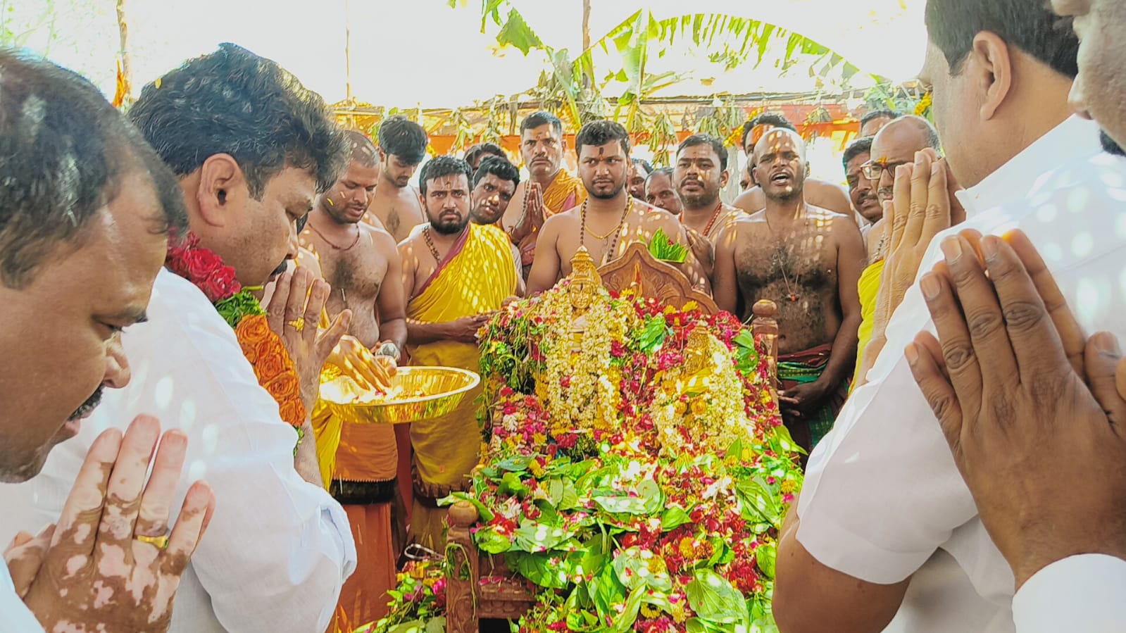 మూడు చింతలపల్లి మండలం లక్ష్మాపూర్ గ్రామంలో రాముల గుట్టపై ప్రతిష్టాపన మహోత్సవ వేడుక ఈరోజు వేద మంత్రోచ్ఛారణల మధ్య, గ్రామస్తులు అత్యంత భక్తిశ్రద్ధలతో నిర్వహించారు. ఈ మహోత్సవానికి టిపిసిసి సీనియర్ అధికార ప్రతినిధి, మేడ్చల్ నియోజకవర్గ కాంగ్రెస్ పార్టీ కోఆర్డినేటర్ సింగిరెడ్డి హరివర్ధన్ రెడ్డి హాజరై దేవాలయంలో జరిగిన హోమం తదితర పూజా కార్యక్రమాలలో పాల్గొని, వేద పండితుల ఆశీర్వచనాలు అందుకొని ,తీర్థప్రసాదాలు స్వీకరించారు .ఈ సందర్భంగా ఆలయ కమిటీ ,గ్రామ పెద్దలు, గ్రామ సర్పంచ్ ,ఉపసర్పంచ్ లు సింగం ఆంజనేయులు, కటికల వైద్యనాథ్ గార్ల ఆధ్వర్యంలో హరివర్ధన్ రెడ్డిని ఘనంగా సత్కరించారు. ఈ మహోత్సవంలో హరివర్ధన్ రెడ్డి గారితో పాటు నియోజకవర్గ బి బ్లాక్ కాంగ్రెస్ పార్టీ అధ్యక్షులు వేముల మహేష్ గౌడ్, మూడు చింతలపల్లి మండల కాంగ్రెస్ పార్టీ అధ్యక్షులు బొమ్మలపల్లి నరసింహులు యాదవ్, మేడ్చల్ జిల్లా కాంగ్రెస్ పార్టీ ఓబీసీ సెల్ అధ్యక్షులు గువ్వ రవి ముదిరాజ్, మండల వైస్ ఎంపీపీ మంద శ్రీనివాస్ రెడ్డి, మండల వర్కింగ్ ప్రెసిడెంట్ మాజీ సర్పంచ్ బండి జగన్నాథం ,జిల్లా నాయకులు గౌడవెల్లి బాల్ రెడ్డి, ఘనాపూర్ గ్రామ సర్పంచ్ బద్దం గోపాల్ రెడ్డి, నాయకులు ఏనుగు సంజీవరెడ్డి, మాజీ ఎంపీపీ సింగం సత్యనారాయణ, బండి రవి, మాజీ ఎంపీటీసీ వెంకటేష్, కందాడి శివరాం రెడ్డి,సుమేశ్, ఎస్సీ సెల్ అధ్యక్షులు లక్ష్మణ్, కీసరి నరసింహులు, వీరేశం సేటు, నరసింహులు, శశింధర్ రెడ్డి,భాను తదితరులు పాల్గొన్నారు.