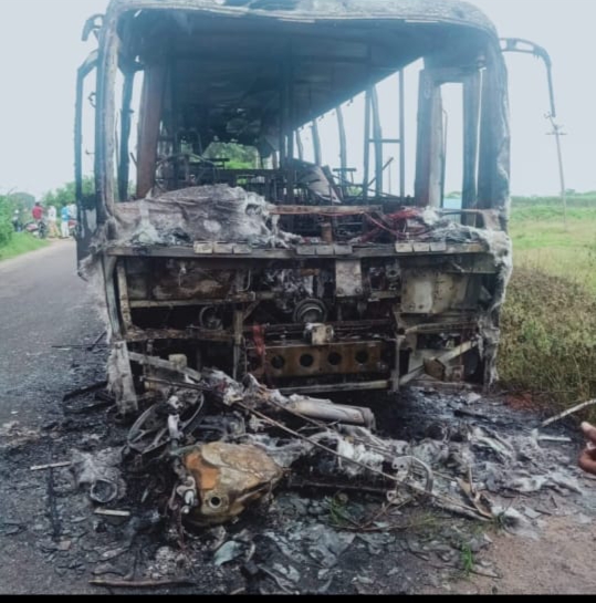 షామీర్పేట్:తుర్కపల్లి కొల్తూరు రోడ్డు మధ్య బస్సు బైక్ ఢీకొని ఘోర రోడ్డు ప్రమాదం జరిగింది .ఈ ప్రమాదం లో ఒక వ్యక్తి అక్కడికక్కడే దుర్మరణం చెందాడు. సిద్దిపేట జిల్లా మారుకుక్ మండలం వరధారాజ్ పురం కు చెందిన సంపత్(35) మూఢుచింతలపల్లి మండలం కొల్తుర్ పరిధిలో ఒక ప్రైవేట్ ఫార్మా కంపెనీలో పని చేస్తున్నాడు. రోజు లాగే వరధారాజ్ పురం నుంచి విధుల్లో భాగంగా కంపెనీ కి ద్విచక్ర వాహనంపై వెళ్తుండగా మార్గమధ్యంలో కర్కపట్ల పరిధి లోని జొడాస్ కంపెనీకి కి చెందిన కంపెనీ బస్ ఉద్యోగులను తీసుకొస్తున్న క్రమంలో ద్విచక్రవాహనాన్ని ఢీ కొట్టింది. దింతో బస్సు కిందకీ బైక్ వెళ్లడంతో అందులో చిక్కుకున్న వ్యక్తిని బస్సు ఈడ్చుకుంటూ కొద్ది దూరం వరకు లాక్కెళ్ళింది. సంపత్ పక్కనే ఉన్న పొదల్లో పడి అక్కడికక్కడే మృతి చెందాడు.బైక్ పెట్రోల్ ట్యాంక్ తెరుచుకొని రాపిడి వల్లన మంటలు చెలరేగి బస్ పూర్తిగా కాలిపోయింది . మృతుడికి ఇద్దరు కుమార్తెలు ఒక కుమారుడు.