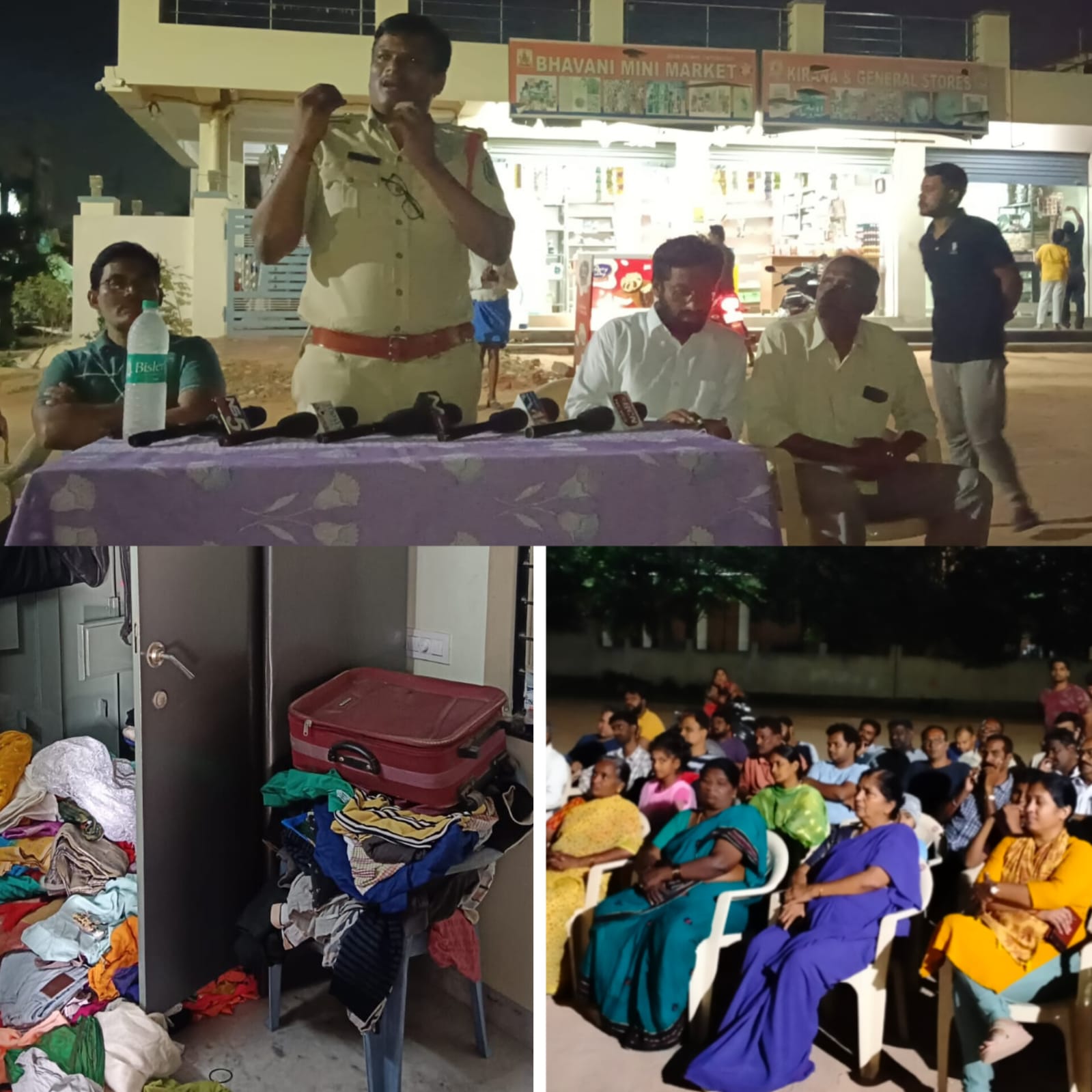 మేడ్చల్ ముచ్చట్లు: కీసర మండలం రాంపల్లి ఒకటో వార్డు రాయల్ ఫోర్ట్ హోమ్స్ అసోసియేషన్ కాలనీలో ఒకేరోజు రెండు రెండు దొంగతనాలు జరగడంతో కాలనీవాసులు భయాందోళనకు గురయ్యారు, ఇంటి యజమాని రామకృష్ణ వివరాల ప్రకారం అతను తమ బంధువుల ఇంటికి వెళ్ళాడని, ఉదయం వెళ్లి మరుసటి రోజు సాయంత్రం తిరిగి వచ్చేసరికి ఇంటి తలుపు గెడ విరిగి ఉండడం గమనించి లోపల వెళ్లి చూసేసరికి బీరువా బద్దలు కొట్టి బీరువాలో ఉన్నా సుమారు మూడు తులాల బంగారం, సుమారు 15 తులాల వెండి దొంగతనం జరిగిందని, అదే కాలనీకి చెందిన మరొక ఇంట్లో ఎటువంటి విలువైన వస్తువులు లేకపోవడంతో దొంగలించ లేకపోయారని తెలిపారు, ఇంటి యజమాని వెంటనే అదే రాత్రి పోలీసులకి ఫిర్యాదు చేయగా, ఉదయాన్నే సంఘటన స్థలానికి కీసర పోలీస్ స్టేషన్ ఎస్ఐ రాజశేఖర్ పోలీస్ సిబ్బందితో వచ్చి ఇంటి యజమాని నుంచి వివరాలు సేకరించి, కేసు నమోదు చేశారు. అనంతరం అదే రోజు సాయంత్రం కాలనీవాసులు సమక్షంలో దొంగతనాలు, నేరాల గురించి కాలనీ నివాసులు అప్రమత్తంగా ఉండాలని అవగాహన సదస్సు నిర్వహించారు, ఈ కార్యక్రమంలో కాలనీ ప్రెసిడెంట్ ప్రవీణ్ రాజు, జనరల్ సెక్రెటరీ పరమేష్, ట్రెజరర్ ఆనంద్ నాదన్, ఆర్గనైజింగ్ సురేష్, కాలనీ కమిటీ సభ్యులు, కాలనీవాసులు పాల్గొన్నారు.